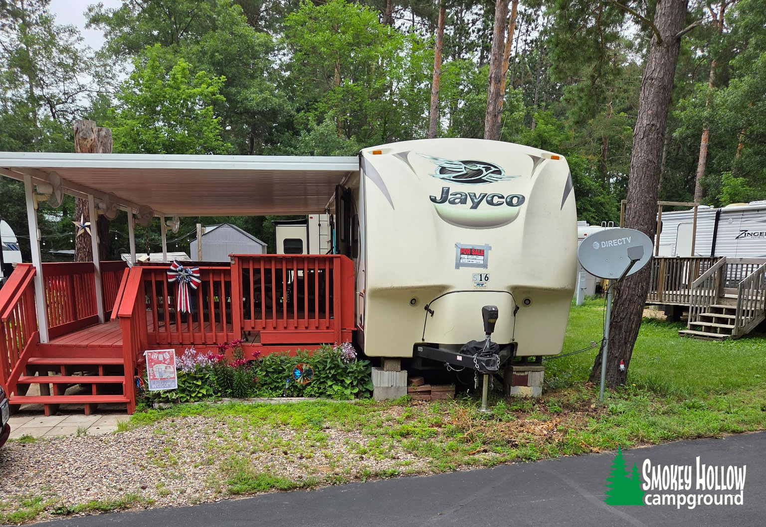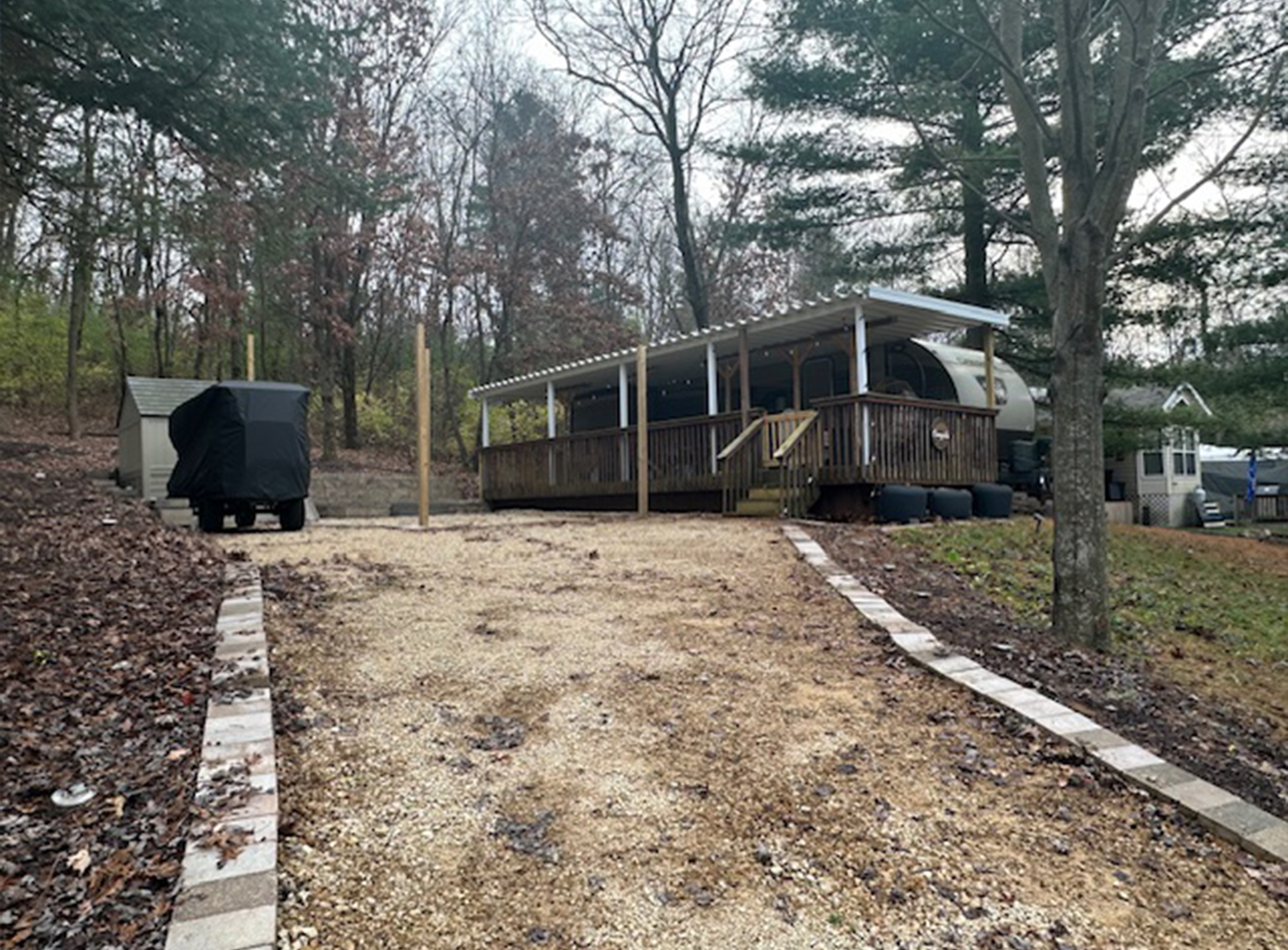 Site 171 - 2020 Forest River Cherokee. 39 feet. Includes deck, shed, firepit, string lights. Shaded lot on the hill. Excellent condition. Well-maintained. 3 slide-outs. Sleeps 8. 1 bedroom with cabinets and storage under bed. 2 couches that open to beds with under storage. 2 recliners. Kitchen table folds down to bed with under storage. Skylight in kitchen and shower. 2 entry doors. Outdoor refrigerator, stove, and ice maker. Windows surround camper. Kitchen island with bar stools. Bathroom with full size shower. Electric retractable awning. A/C, heat, electric fireplace. Refrigerator, freezer, gas stove and range. Microwave. Storage pantry. Outdoor speakers with blue lights inside and out. Backup solar power. Asking $38,000.