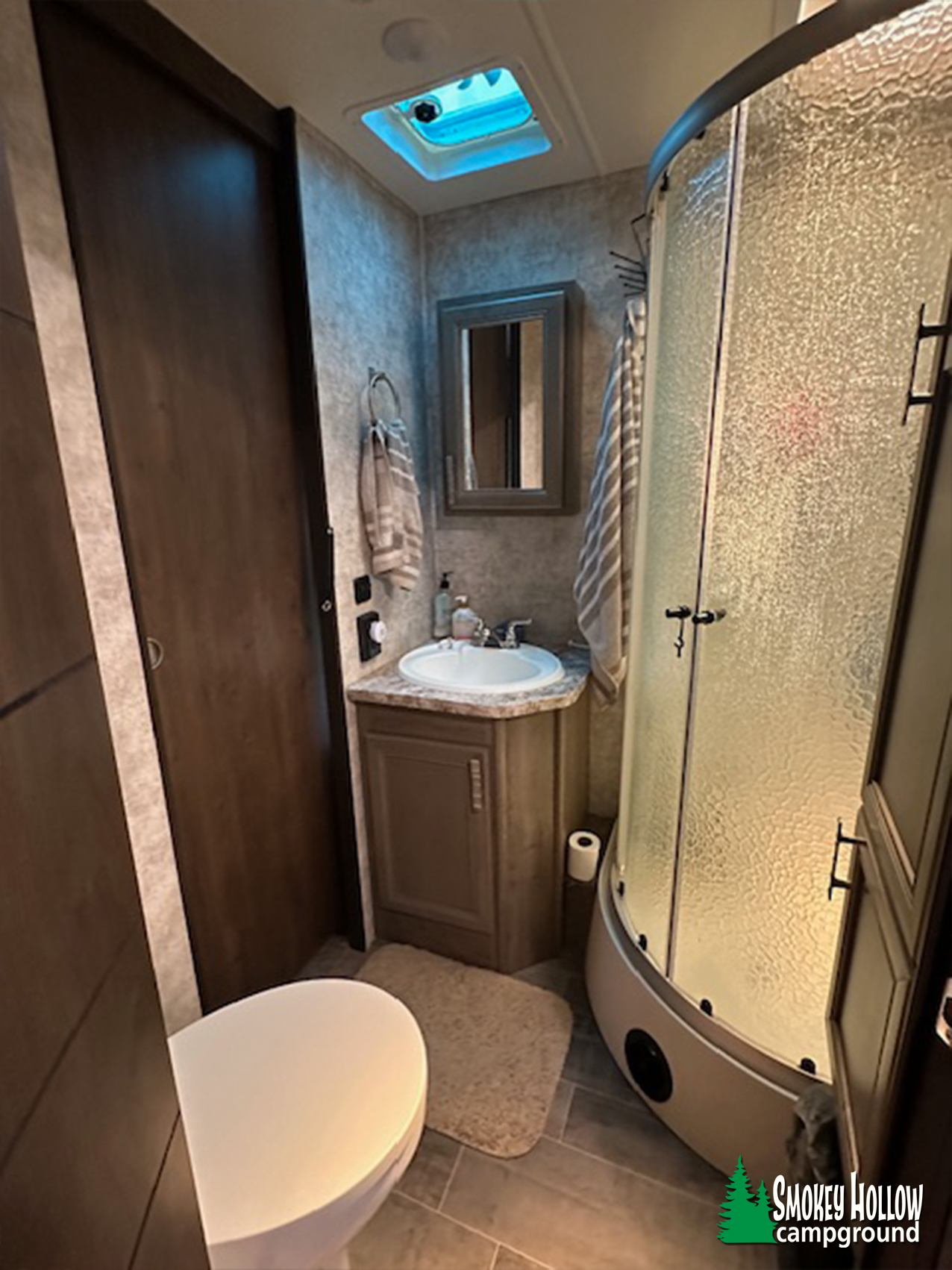 • Bathroom with shower and essentials.