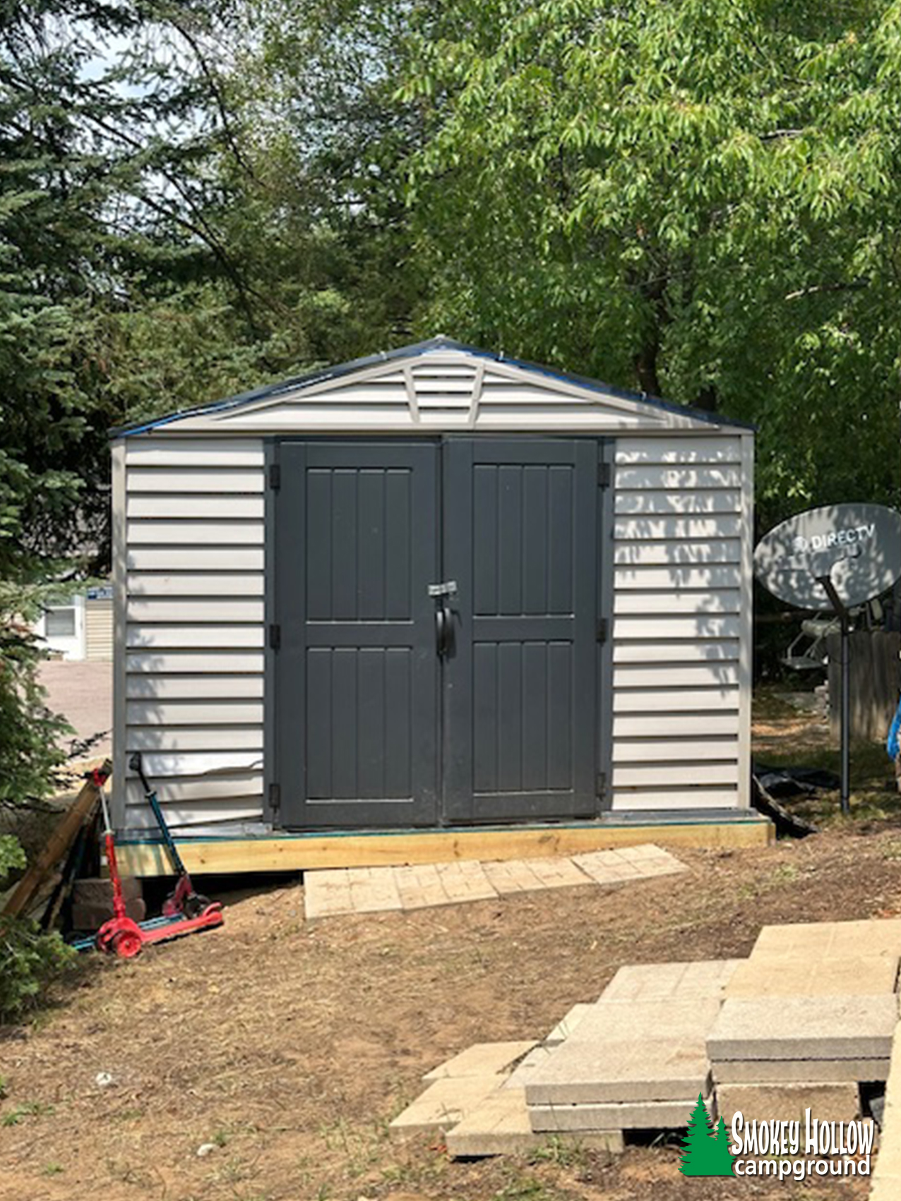 • Shed with shelving/storage and full-size fridge included, plus push mower – everything you need to keep the site in top shape.